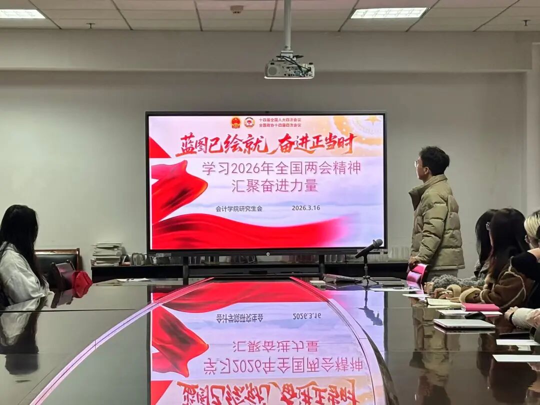 春潮涌动启新篇,凝心聚力向未来。2026年正值“十五五”开局之年,全国两会备受瞩目。为深入学习贯彻2026年全国两会精神,会计学院研究生会于3月16日在综合楼802会议室组织“蓝图已绘就,奋进正当时”两会专题学习活动。